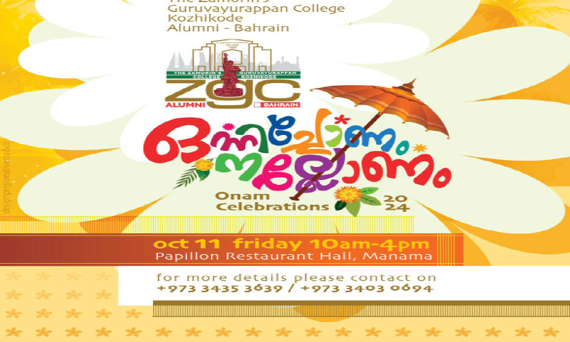 മനാമ: സാമൂതിരി ഗുരുവായൂരപ്പൻ കോളജ് -കോഴിക്കോട്, ബഹ്റൈനിലെ പൂർവ വിദ്യാർഥി കൂട്ടായ്മയുടെ ഈ വർഷത്തെ ഓണാഘോഷം ‘ഒന്നിച്ചോണം നല്ലോണം’ 11ന് രാവിലെ 10 മണിമുതൽ വൈകീട്ട് നാലുവരെ മനാമ പാപ്പിലോൺ റസ്റ്റാറന്റ് ഹാളിൽ നടക്കും. കൂടുതൽ വിവരങ്ങൾക്കും ഈ കൂട്ടായ്മയുടെ ഭാഗമാകാനും +973 34353639 / +973 34030694 എന്നീ നമ്പറുകളിൽ ബന്ധപ്പെടാവുന്നതാണ്.