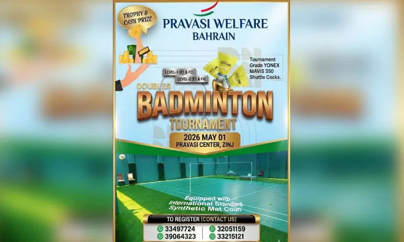 text_fieldsമനാമ: ലോക തൊഴിലാളി ദിനത്തോടനുബന്ധിച്ച് പ്രവാസി വെൽഫെയർ എല്ലാ വർഷവും സംഘടിപ്പാക്കാറുള്ള മെയ് ഫെസ്റ്റിൻ്റെ ഭാഗമായി പ്രവാസി വെൽഫെയർ ഡബിൾസ് ബാഡ്മിന്റൺ ടൂർണമെന്റ് 2026 സംഘടിപ്പിക്കുന്നു. മേയ് 1ന് സിന്ജിലെ പ്രവാസി സെൻ്ററിലെ അന്താരാഷ്ട്ര നിലവാരത്തിലുള്ള സിന്തറ്റിക്മാറ്റ് ബാഡ്മിൻറൺ കോർട്ടിലാണ് മത്സരങ്ങൾ നടക്കുക.