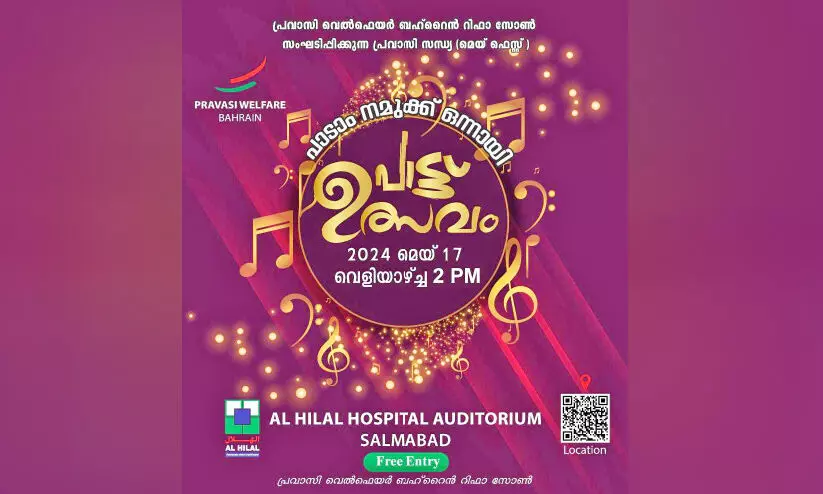 സൽമാബാദിലുള്ള അൽ ഹിലാൽ ഹോസ്പിറ്റൽ ഓഡിറ്റോറിയത്തിൽ ബഹ്റൈനിലെ പ്രവാസി കലാകാരന്മാർ നയിക്കുന്ന ഗാനമേള, മിമിക്സ് പരേഡ്, കഥാപ്രസംഗം, കവിതാലാപനം, മാപ്പിളപ്പാട്ട്, നാടൻപാട്ടുകൾ തുടങ്ങി മലയാളിത്തനിമ ഉൾക്കൊണ്ടുള്ള പരിപാടികളാണ് ഒരുക്കിയിട്ടുള്ളത്. പാട്ടുത്സവത്തിലേക്ക് പ്രവേശനം സൗജന്യമാണെന്ന് പ്രവാസി വെൽഫെയർ റിഫ സോണൽ പ്രസിഡന്റ് ആഷിക്ക് എരുമേലി, സെക്രട്ടറി മഹ്മൂദ് മായൻ എന്നിവർ അറിയിച്ചു.