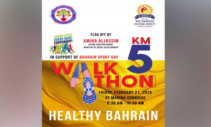 മനാമ: ബഹ്റൈൻ കായിക ദിനത്തോടനുബന്ധിച്ചു എസ്.എൻ.സി.എസ് കൂട്ടനടത്തം സംഘടിപ്പിക്കുന്നു. നാളെ രാവിലെ ഒമ്പതിന് ബഹ്റൈൻ മറീന ഡോൾഫിൻ പാർക്കിൽ ബഹ്റൈൻ സാമൂഹികവികസന മന്ത്രാലയം പ്രതിനിധി ആമിന അൽ ജാസിം പരിപാടി ഉദ്ഘാടനം ചെയ്യും. തുടർന്ന് 200ൽ ഏറെ പേർ പങ്കെടുക്കുന്ന അഞ്ച് കിലോമീറ്റർ നടത്തം സംഘടിപ്പിക്കും. കൂടുതൽ വിവരങ്ങൾക്കായി 39605002 എന്ന നമ്പറിൽ ബന്ധപ്പെടേണ്ടതാണ്.