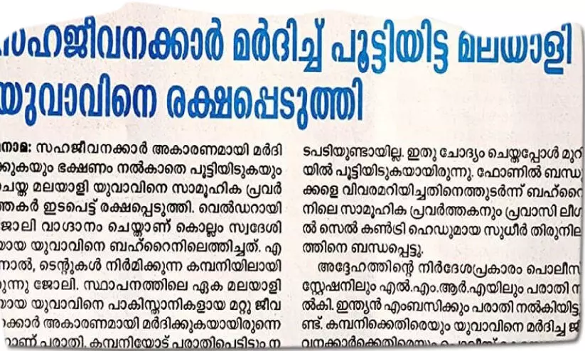 text_fieldsമനാമ: സഹജീവനക്കാർ അകാരണമായി മർദിക്കുകയും ഭക്ഷണം നൽകാതെ പൂട്ടിയിടുകയും ചെയ്ത മലയാളി യുവാവിന് പാസ്പോർട്ടും ജോലിചെയ്ത കാലയളവിലെ ശമ്പളവും ലഭിച്ചു. ബഹ്റൈനിലെ സാമൂഹിക പ്രവർത്തകനും പ്രവാസി ലീഗൽ സെൽ കൺട്രി ഹെഡുമായ സുധീർ തിരുനിലത്തിനെ ബന്ധപ്പെട്ടതിനെത്തുടർന്ന് പൊലീസ് സ്റ്റേഷനിലും എൽ.എം.ആർ.എയിലും പരാതി നൽകിയിരുന്നു. വിഷയത്തിൽ ഇന്ത്യൻ എംബസിയും ഇടപെട്ടു. തുടർന്നാണ് നടപടിയുണ്ടായത്. യുവാവിന്റെ അവസ്ഥ വിവരിച്ച് ‘ഗൾഫ് മാധ്യമം’ വാർത്ത നൽകിയിരുന്നു. വെൽഡറായി ജോലി വാഗ്ദാനം ചെയ്താണ് കൊല്ലം സ്വദേശിയായ യുവാവിനെ ബഹ്റൈനിലെത്തിച്ചത്.