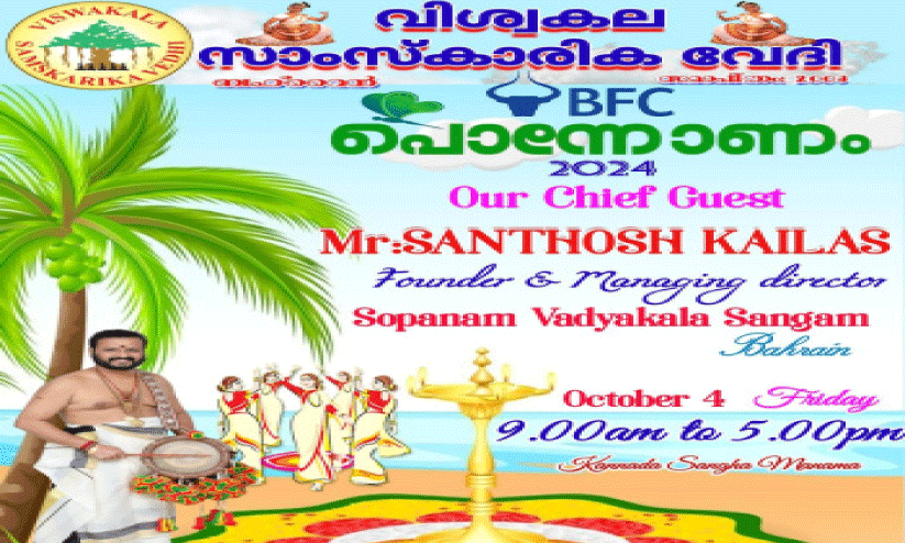 text_fieldsമനാമ: വിശ്വകല സാംസ്കാരിക വേദിയുടെ ഈ വർഷത്തെ ഓണാഘോഷം ‘പൊന്നോണം 2024’ ഒക്ടോബർ നാലിന് മനാമ കന്നട സംഘ ഓഡിറ്റോറിയത്തിൽ സംഘടിപ്പിക്കുന്നു.