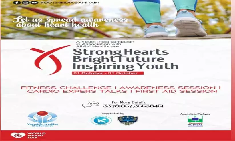 text_fieldsമനാമ: യൂത്ത് ഇന്ത്യ ബഹ്റൈൻ ‘സ്ട്രോങ് ഹാർട്ട്, ബ്രൈറ്റ് ഫ്യൂച്ചർ, ഇൻസ്പയറിങ് യൂത്ത്’ എന്ന തലക്കെട്ടിൽ അൽ ഹിലാൽ ഹോസ്പിറ്റലുമായി സഹകരിച്ച് ഒക്ടോബർ ഒന്നുമുതൽ 31 വരെ ഹെൽത്ത് കാമ്പയിൻ സംഘടിപ്പിക്കുന്നു. പ്രവാസി യുവാക്കളിലെ ആരോഗ്യപരമായ ജീവിത ശൈലി വാർത്തെടുക്കാനും നിത്യ ജീവിതത്തിൽ വ്യായാമത്തിന്റെ പ്രാധാന്യം മനസ്സിലാക്കാനും അത് തുടർന്നുള്ള പ്രവാസ ജീവിതത്തിൽ കൈക്കൊള്ളാനും അടിയന്തര മെഡിക്കൽ രീതികൾ സ്വായക്തമാക്കാനും ഈ കാമ്പയിൻ കൊണ്ട് സാധ്യമാകും.