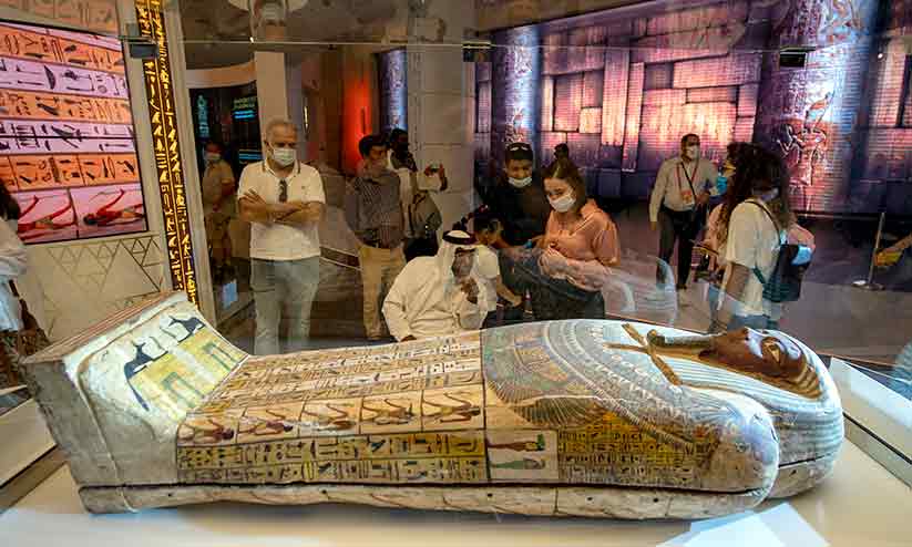 പവലിയൻ പ്രധാന കവാടത്തിൽ പ്രവേശിക്കുമ്പോൾ, ഈജിപ്തിലെ സഖാരയിൽ നിന്ന് അടുത്തിടെ കണ്ടെത്തിയ പുരാതന ഈജിപ്ത്യൻ പുരോഹിതൻ സാംടിക്കിെൻറ യഥാർഥ ശവപ്പെട്ടിയാണ് കാണാനാവുക. ഈജിപ്തിൽ നിന്ന് വിമാനത്തിൽ പറന്നെത്തിയ വർണങ്ങളും ചിത്രങ്ങളും നിറഞ്ഞ പുരാതന ശവപ്പെട്ടി ആദ്യമായാണ് ഒരു ആഗോള പരിപാടിയിൽ പ്രദർശിപ്പിക്കുന്നത്. പവലിയനിൽ അകത്തെ പ്രദർശനത്തിൽ 'തൂത്തൻഖാമുൻ' രാജാവിെൻറ സ്വർണ മുഖംമൂടിയുടെ പകർപ്പും ഉപകരണങ്ങളുടെയും പുരാവസ്തുക്കളുടെയും പകർപ്പും കാണാനാവും. അതിന് പുറമെ പുതിയ ഈജിപ്തിനെ പരിചയപ്പെടുത്തുന്നതിനായി സമീപകാലത്ത് പൂർത്തിയായ ഗ്രാൻഡ് ഈജിപ്ത്യൻ മ്യൂസിയം, സൂയസ് കനാൽ ഇക്കണോമിക് സോൺ, ദി റോബിക്കി സിറ്റി തുടങ്ങിയ ചില പ്രധാന പദ്ധതികൾ സ്ക്രീനുകളിൽ പ്രദർശിപ്പിക്കുന്നുമുണ്ട്.