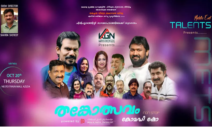 മിമിക്രി, സ്കിറ്റ്, നൃത്തം, ഗാനങ്ങൾ എന്നിവയായിരിക്കും മുഖ്യയിനങ്ങൾ. പരിപാടി സംവിധാനം ചെയ്യുന്നത് ഷാരോൺ ശരീഫാണ്. തങ്കച്ചൻ നാട്ടിൽനിന്നും ബിജു ദുബൈയിൽനിന്നും എത്തിച്ചേർന്നതായി സംഘാടകർ അറിയിച്ചു. പഴയകാല കോമഡി, മിമിക്രി പരിപാടികൾ അനുസ്മരിപ്പിക്കുന്നപോലെ തയാറാക്കിയിട്ടുള്ള പരിപാടി ഭിന്നമായ അനുഭവമായിരിക്കുമെന്ന് ഷാരോൺ പറഞ്ഞു.
