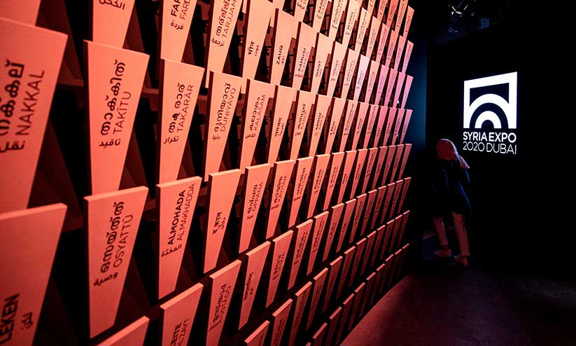 ക്രിസ്തുവിന് 1400 വർഷം മുൻപ് അക്ഷരമാല ഇവിടെ കാണാം. കല്ലിൽ എഴുതിയ ഈ അക്ഷരമാലയാണ് ലോകത്തെ ആദ്യത്തെ അക്ഷരങ്ങൾ എന്നാണ് സിറിയക്കാരുടെ അവകാശവാദം. 30 അക്ഷരങ്ങൾ ഇതിലുണ്ട്. ഈ കല്ലിന്റെ രൂപവും പ്രദർശിപ്പിച്ചിട്ടുണ്ട്. തങ്ങളുടെ ഭാഷയാണ് അറബി ഉൾപെടെയുള്ള പലഭാഷകളെയും പിന്നീട് സ്വാധീനിച്ചതെന്നാണ് ഇവർ പറയുന്നത്. അക്ഷരം മാത്രമല്ല, സംഗീതവും ആദ്യമായി പിറവികൊണ്ടത് സിറിയയിലാണെന്ന് പവലിയനിൽ എഴുതിവെച്ചിരിക്കുന്നു. ബി.സി 2600ൽ എഴുതപ്പെട്ട കവിതയെ കുറിച്ച് പവലിയനിൽ വിശദമാക്കുന്നുണ്ട്. 'മ്യൂസിക് ഫ്രം ഉഗറിത്' എന്ന പേരിൽ ഇവിടെ കവിതയുടെ ചരിത്രം എഴുതിവെച്ചിട്ടുണ്ട്. കുട്ടികളുണ്ടാകാൻ വേണ്ടി സിറിയൻ സ്ത്രീ അവരുടെ ദൈവത്തോട് പ്രാർഥിച്ചതാണ് ഈ കവിത. ഇതിനെ കുറിച്ച് വിശദമാക്കുന്ന വീഡിയോ പ്രദർശനവും കാണാം.