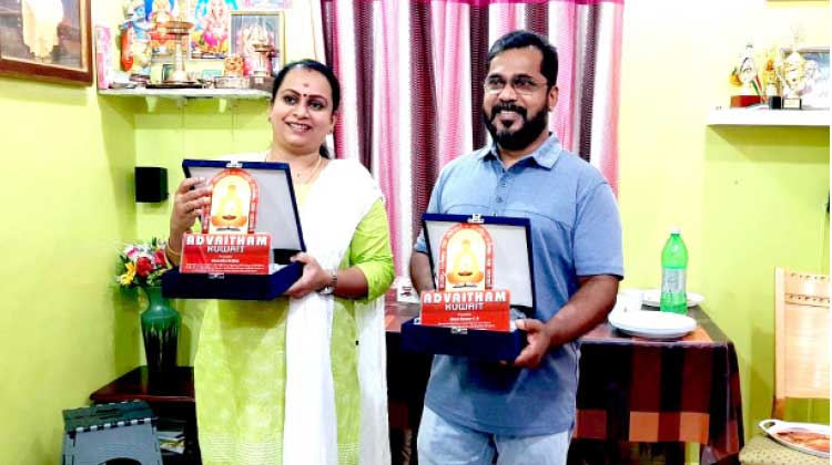 പ്രവാസജീവിതം അവസാനിപ്പിച്ച് നാട്ടിലേക്ക് മടങ്ങുന്ന അദ്വൈതം കുവൈത്ത് അംഗങ്ങളായ അജയകുമാറും അദ്വൈതം വനിതവേദി അധ്യക്ഷ വിനീത ബ്രിജേഷും