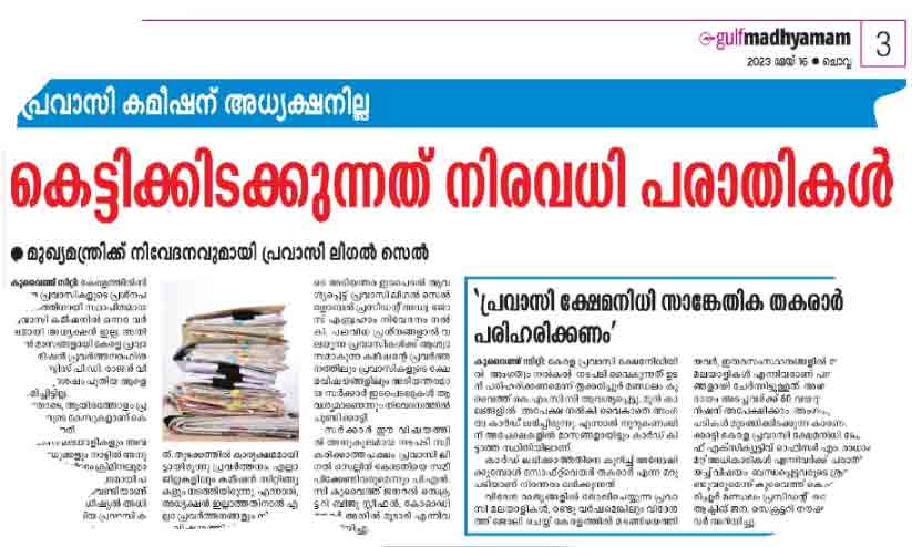 കേരളത്തിൽനിന്നുള്ള പ്രവാസികളുടെ പ്രശ്നപരിഹാരത്തിനായി സ്ഥാപിതമായ പ്രവാസി കമീഷനിൽ ഒന്നര വർഷമായി അധ്യക്ഷനില്ല. അധ്യക്ഷനില്ലാത്തതിനാൽ കമീഷൻ പ്രവർത്തനം സ്തംഭിച്ചു. ഇതോടെ ആയിരത്തോളം പ്രവാസികളുടെ കേസുകളാണ് കെട്ടിക്കിടക്കുന്നത്.