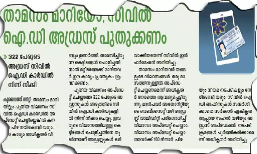 text_fieldsകുവൈത്ത് സിറ്റി: താമസം മാറിയിട്ടും പുതിയ വിലാസം സിവിൽ ഐഡി കാർഡിൽ അപ്ഡേറ്റ് ചെയ്യാത്തവർക്കെതിരെ നടപടി തുടരുന്നു. പുതിയ വിലാസം അപ്ഡേറ്റ് ചെയ്യാത്ത 269 പേരുടെ അഡ്രസ്സുകള് സിവില് ഐ.ഡി കാര്ഡുകളിൽ നിന്ന് നീക്കിയതായി പ്രാദേശിക മാധ്യമങ്ങൾ റിപ്പോർട്ട് ചെയ്തു. ഇവർ നേരത്തെ താമസിച്ചിരുന്ന കെട്ടിടങ്ങൾ പൊളിച്ചതിനെ തുടർന്നാണ് നടപടി. വിലാസം നീക്കിയവർ പുതിയ വിലാസം 30 ദിവസത്തിനുള്ളിൽ രജിസ്റ്റർ ചെയ്യണം.