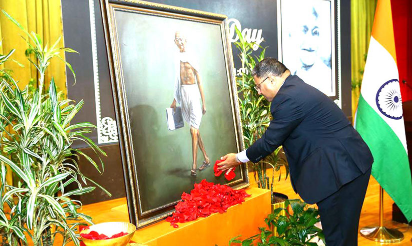 ഇന്ത്യൻ എംബസി നടത്തിയ ഗാന്ധിജി അനുസ്മരണത്തിൽ ഗാന്ധിജിയുടെ ഛായാചിത്രത്തിൽ അംബാസഡർ സിബി ജോർജ് പുഷ്പാർച്ചന നടത്തുന്നു