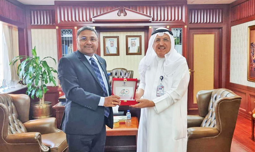 ഇന്ത്യൻ അംബാസഡർ സിബി ജോർജ് കുവൈത്ത് എയർവേസ് കോർപറേഷൻ ചെയർമാൻ അലി അൽദുഖാനുമായി കൂടിക്കാഴ്ച നടത്തിയപ്പോ