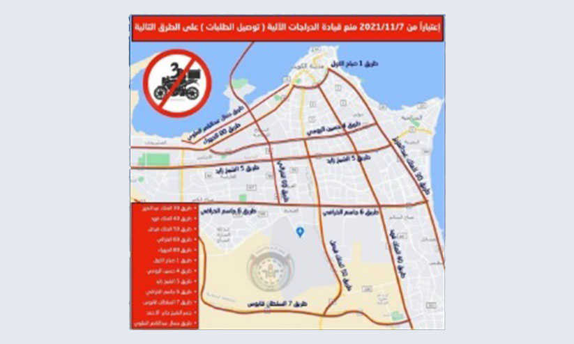 ട്രാഫിക് ആൻഡ് ഓപറേഷൻ അഫയേഴ്സ് അസിസ്റ്റൻറ് അണ്ടർ സെക്രട്ടറി മേജർ ജനറൽ ജമാൽ അൽ സായിഗ് അറിയിച്ചതാണിത്. ബൈക്ക് അപകടങ്ങൾ പത്തുവർഷത്തിനിടെ കുത്തനെ ഉയർന്നിട്ടുണ്ട്. ഡെലിവറി മോട്ടോർ ബൈക്ക് ഒാടിക്കുന്നവർ റോഡുകളിൽ സുരക്ഷയും നിയമങ്ങളും പാലിക്കുന്നില്ലെന്ന് ആരോപണമുണ്ട്. ട്രാക്ക് തെറ്റിക്കുന്നതും അമിത വേഗത്തിൽ പായുന്നതും അപകടത്തിന് കാരണമാകുന്നുവെന്ന് ചൂണ്ടിക്കാട്ടിയാണ് പ്രധാന റോഡുകളിൽ ഇവക്ക് വിലക്ക് ഏർപ്പെടുത്തിയത്.