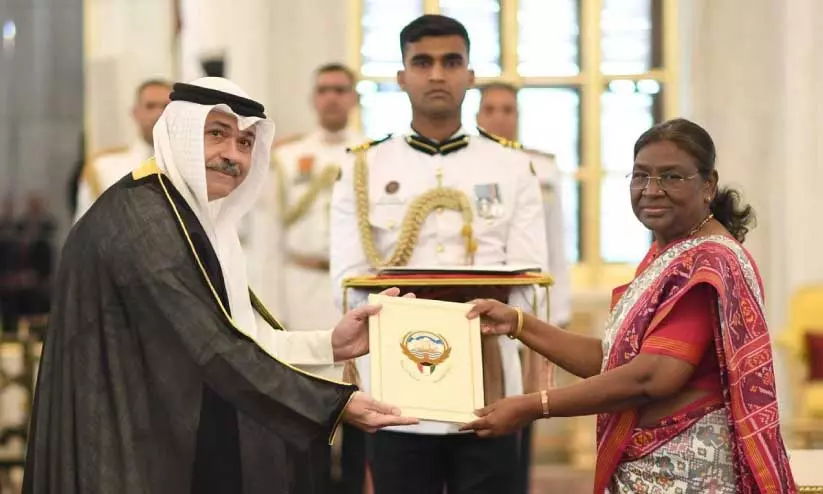 കുവൈത്ത് അംബാസഡർ മിഷാൽ അൽ ഷമാലി ഇന്ത്യന് രാഷ്ട്രപതി ദ്രൗപതി മുർമുവിന് യോഗ്യത പത്രം കൈമാറുന്നു