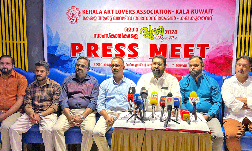 അബ്ബാസിയ കാലിക്കറ്റ് ഷെഫ് റസ്റ്റാറന്റിൽ നടന്ന വാർത്ത സമ്മേളനത്തിൽ കല കുവൈത്ത് പ്രസിഡന്റ് അനുപ് മങ്ങാട്ട്, ജനറൽ സെക്രട്ടറി സജി തോമസ് മാത്യു, ‘ദ്യുതി- 2024’ ജനറൽ കൺവീനർ ജെ. സജി, കല കുവൈത്ത് ട്രഷറർ അനിൽ കുമാർ, വൈസ് പ്രസിഡന്റ് റിച്ചി കെ. ജോർജ്, ജോ. സെക്രട്ടറി ബിജോയ്, മീഡിയ വിഭാഗം സെക്രട്ടറി പ്രജോഷ് എന്നിവർ പങ്കെടത്തു.