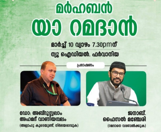 കുവൈത്ത് സിറ്റി: കേരള ഇസ്ലാമിക് ഗ്രൂപ്പ് ഫർവാനിയ ഏരിയ വിശുദ്ധ റമദാൻ മാസത്തെ വരവേൽക്കാനും മുന്നൊരുക്കങ്ങൾക്കുമായി 'മർഹബൻ യാ റമദാൻ' പരിപാടി സംഘടിപ്പിക്കുന്നു. വ്യാഴാഴ്ച രാത്രി 7.30ന് ഫർവാനിയ ന്യൂ െഎഡിയൽ ഒാഡിറ്റോറിയത്തിലാണ് പരിപാടി. 'അല്ലാഹു കൂടെയുണ്ട്, നിർഭയരാകുക' വിഷയത്തിൽ പ്രമുഖ പണ്ഡിതൻ ഡോ. അബ്ദുസ്സലാം അഹ്മദ് വാണിയമ്പലവും 'റമദാനെ വരവേൽക്കുക' തലക്കെട്ടിൽ കെ.െഎ.ജി വൈസ് പ്രസിഡൻറ് ഫൈസൽ മഞ്ചേരിയും സംസാരിക്കുമെന്ന് ഭാരവാഹികൾ അറിയിച്ചു.