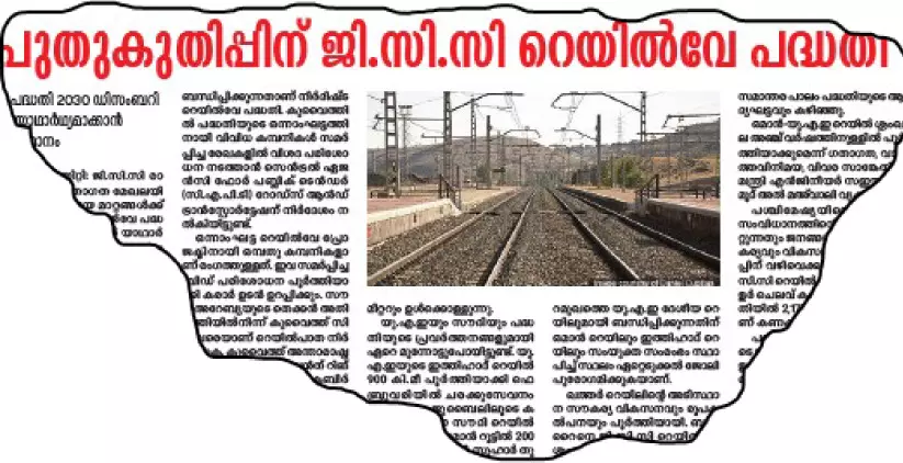 ജി.സി.സി റെയിൽവേ പദ്ധതി 2030 ഡിസംബറിനകം യാഥാർഥ്യമാക്കാൻ കഴിഞ്ഞ ദിവസം മസ്കത്തിൽ ചേർന്ന ജി.സി.സി ഗതാഗത, വാർത്താവിനിമയ മന്ത്രാലയങ്ങളുടെ അണ്ടർ സെക്രട്ടറിമാരുടെ സമിതി തീരുമാനിച്ചിരുന്നു. പശ്ചിമേഷ്യയിലെ വാണിജ്യ സഞ്ചാരം സുഗമമാക്കുക എന്ന ലക്ഷ്യത്തോടെയാണ് ഗള്ഫ് റെയില്വേ പദ്ധതിക്ക് രൂപം നല്കിയത്. 25 ബില്യൻ ഡോളർ ചെലവ് കണക്കാക്കുന്ന പദ്ധതിയിൽ 2,177 കി.മീറ്റർ ദൈർഘ്യമാണ് ദൂരം.