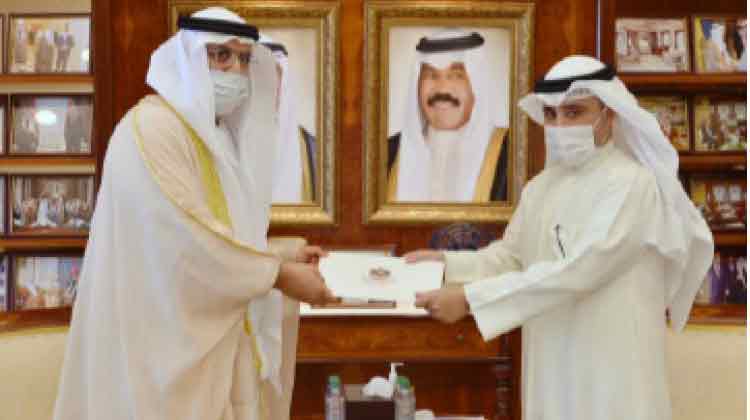 കുവൈത്ത് വിദേശകാര്യ മന്ത്രി ഡോ. അഹ്മദ് നാസർ അൽ മുഹമ്മദ് അസ്സബാഹിന് യു.എ.ഇ വിദേശകാര്യ മന്ത്രി ശൈഖ് അബ്ദുല്ല ബിൻ സായിദ് അൽ നഹ്യാെൻറ കത്ത് യു.എ.ഇ അംബാസഡർ കൈമാറുന്നു