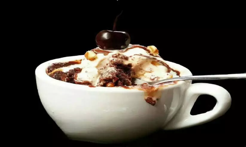 ഇതിലേക്ക് പാൽ, എണ്ണ, വാനില എസ്സെൻസ് എന്നിവ ചേർത്ത് നന്നായി യോജിപ്പിക്കുക. ഇതിലേക്ക് ചോക്ലറ്റ് ചിപ്സ്, വാൾനട്ട് എന്നിവ ചേർത്ത് ഇളക്കുക. മിശ്രിതത്തിന്റെ മുകൾഭാഗം വേവുന്നതുവരെ മൈക്രോവേവ് ചെയ്യുക (ഏകദേശം 2 മിനിറ്റ് മുതൽ 2.30 മിനിറ്റ് വരെ). ഇതിനുമുകളിൽ ഒരു സ്കൂപ്പ് ഐസ്ക്രീം, ചെറി എന്നിവ ചേർത്ത് ചൂടോടെ സേർവ് ചെയ്യുക.