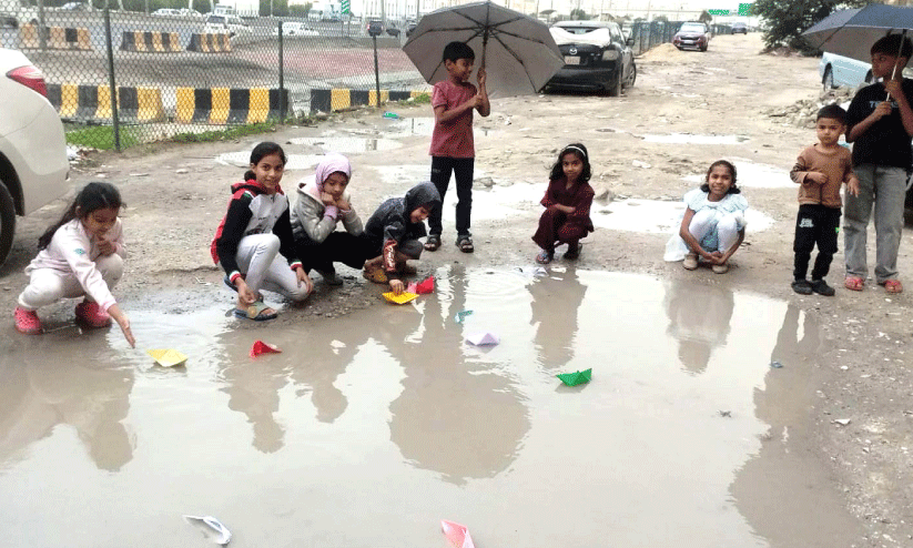 text_fieldsബുധനാഴ്ച പെയ്ത മഴയിലെ വെള്ളക്കെട്ടിൽ കടലാസുതോണി ഒഴുക്കുന്ന കുട്ടികൾ. അബ്ബാസിയ