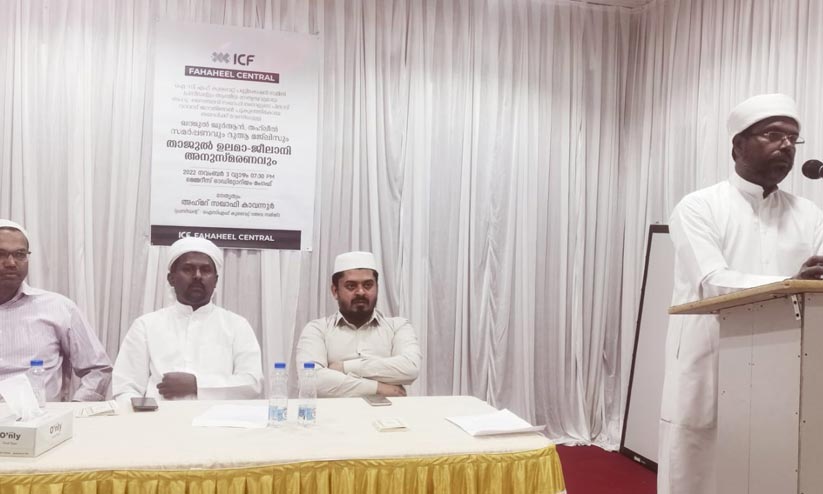 ഐ.സി.എഫ് ഫഹാഹീൽ സെൻട്രൽ കമ്മിറ്റി സംഘടിപ്പിച്ച ശൈഖ് ജീലാനി, താജുൽ ഉലമ അനുസ്മരണ സംഗമം ഉദ്ഘാടനം ചെയ്യുകയായിരുന്നു അദ്ദേഹം. സെൻട്രൽ ഐ.സി.എഫ് പ്രസിഡന്റ് ശംസുദ്ദീൻ കാമിൽ സഖാഫി അധ്യക്ഷത വഹിച്ചു.സ്വാദിഖ് തങ്ങൾ പ്രാരംഭ പ്രാർഥന നടത്തി.അബ്ദുൽ ലത്തീഫ് തോന്നിക്കര സ്വാഗതവും നവാസ് ശംസുദ്ദീൻ നന്ദിയും പറഞ്ഞു.