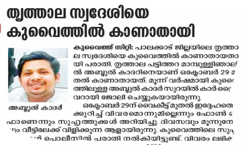 text_fieldsകുവൈത്ത് സിറ്റി: കുവൈത്തിൽ കാണാതായ പാലക്കാട് തൃത്താല സ്വദേശി മമ്പുള്ളിഞ്ഞാലിൽ അബ്ദുൽ ഖാദിർ പൊലീസ് കസ്റ്റഡിയിൽ. സ്പോൺസർ നൽകിയ പരാതിയെ തുടർന്നാണ് ഇദ്ദേഹത്തെ കസ്റ്റഡിയിൽ എടുത്തത്. നിയമ നടപടികൾക്കു ശേഷം അബ്ദുൽ ഖാദിറിനെ നാട്ടിലേക്ക് കയറ്റി അയക്കുമെന്നും സ്പോൺസറുമായി ബന്ധപ്പെട്ടവർ അറിയിച്ചു. അബ്ദുൽ ഖാദിറിന്റെ പാസ്പോർട്ടും മറ്റു രേഖകളും പൊലീസിന് സമർപ്പിച്ചിട്ടുണ്ട്. ബുധനാഴ്ച വൈകീട്ടോടെയാണ് അബ്ദുൽ ഖാദിറിനെ കാണാതായത്.