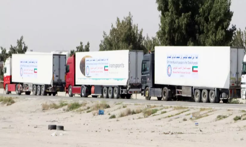 തുർക്കിയ, സിറിയ ഭൂകമ്പം: അവശ്യവസ്തുക്കളുമായി കെ.ആർ.സി.എസ് ട്രക്കുകൾ