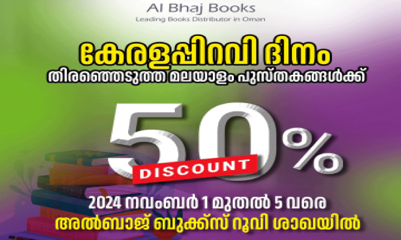 മസ്കത്ത്: കേരളപ്പിറവിയോടനുബന്ധിച്ച് അൽബാജ് ബുക്സിന്റെ റൂവി ശാഖയിൽ മലയാളം പുസ്തകങ്ങൾ 50 ശതമാനം വിലക്കിഴിവിൽ ലഭിക്കും. നവംബർ ഒന്നു മുതൽ അഞ്ചുവരെയാണ് ഈ ആനുകൂല്യം ലഭിക്കുക. മേളയിൽ തിരഞ്ഞെടുത്ത ആയിരത്തിലധികം മലയാള പുസ്തകങ്ങൾ വായനക്കാർക്കായി ഇവിടെ ഒരുക്കിയിട്ടുണ്ട്. പഴയ-പുതിയ തലമുറയിലെ എഴുത്തുകാരുടെ പുസ്തകങ്ങൾ ലഭ്യമാണ്. കൂടുതൽ വിവരങ്ങൾക്കായി 9968 5610,9904 7741