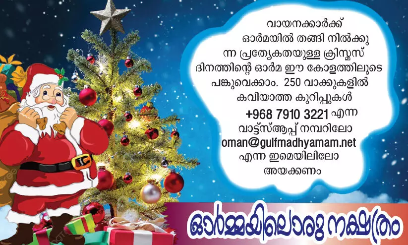 text_fieldsഇന്ന് ലോകം വളരെയേറെ മുന്നോട്ട് പോയിട്ടുണ്ടെങ്കിലും മനുഷ്യരുടെ ഹൃദയങ്ങളിൽ പഴയകാലത്തെ സ്നേഹവും കരുണയും പലപ്പോഴും കുറയുകയാണ്. സ്വാർഥതയും മത്സരവുമാണ് പൊതുവെ കണ്ടുവരുന്നത്. എന്റെ ചെറുപ്പകാലത്ത് ക്രിസ്മസ് കരോൾ വലിയ ആവേശത്തോടുകൂടിയാണ് ഞങ്ങൾ കൂടിയിരുന്നത്. ഏതാണ്ട് ഒരാഴ്ചക്കാലം രാത്രികളിൽ ഈ കരോൾ നീണ്ടുനിൽക്കും. ഗ്രാമത്തിന്റെ എല്ലാ ഭാഗങ്ങളിലും ജാതിമത ഭേദമന്യേ കരോൾ കടന്നു ചെല്ലും. കൂടെ ഞാനും കൂട്ടുകാരും പോകുമായിരുന്നു. അന്നൊക്കെ കരോൾ വരുമ്പോൾ അവർക്ക് വെളിച്ചം ലഭിക്കുവാനായി കൈയിൽ കരുതിയിരുന്ന വിളക്കിന്റെ പേരായിരുന്നു പെട്രോമാക്സ്. ഇന്നത്തെ തലമുറക്ക് അധികം അറിയാനിടയില്ലാത്ത ഒന്നാണ് പെട്രോ മാക്സ്. മണ്ണെണ്ണ ഒഴിച്ച് ഇടക്കിടക്ക് കാറ്റ് നിറച്ചു കൊടുത്തുകൊണ്ടാണ് ഈ വിളക്കുകൾ പ്രകാശിച്ചിരുന്നത്. വെളിച്ചം കുറയുമ്പോൾ അതിൻറെ ടാങ്കിനുള്ളിലേക്ക് കാറ്റ് അടിച്ചു നിറക്കും, അത്യാവശ്യം പരിചയമുള്ള ആളുകൾ മാത്രമാണ് ഇത്തരം ലൈറ്റുകൾ കൈകാര്യം ചെയ്യുക.