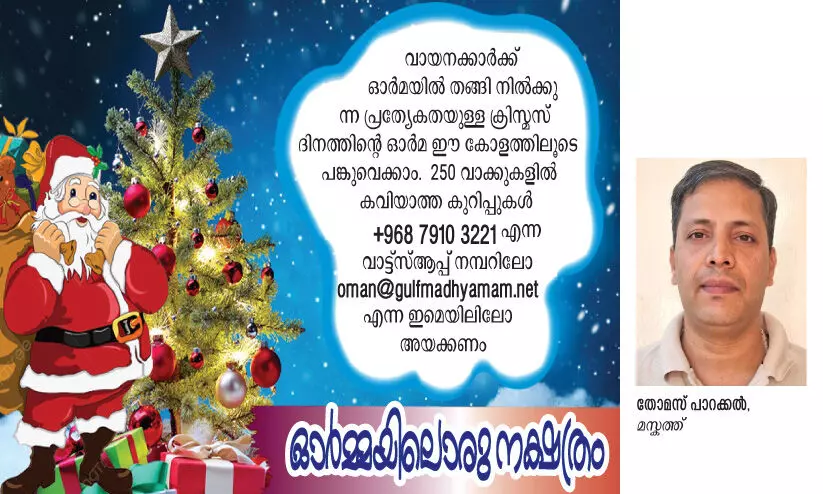 text_fields‘‘മരത്തിൽ കെട്ടി തക്കുന്ന നക്ഷത്രങ്ങൾക്കകത്ത് ചിരട്ടയിൽ മണ്ണും നിറച്ച് അതിൽ മെഴുകുതിരി കത്തിച്ചുവച്ച് അതിൽ നിന്നുള്ള പ്രകാശം തെളിയും. ആ നുറുങ്ങുവെട്ടം കൂരാകൂരിരുട്ടത്തു ആകാശത്തു നക്ഷത്രങ്ങളെ വെല്ലുന്ന ശോഭയായിട്ടാണ് അനുഭവപ്പെട്ടത്...’’