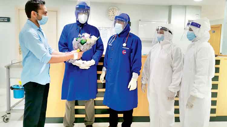 text_fieldsസലാല ബദർ സമയിൽ കോവിഡ് മുക്തനായയാൾ ഡോക്ടർമാർക്കും നഴ്സുമാർക്കും ബൊക്കെ സമ്മാനിക്കുന്നു.