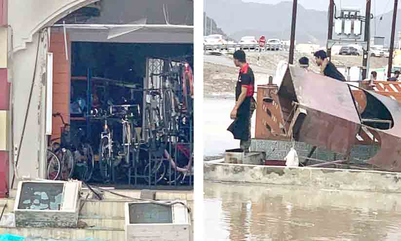 text_fields1. സമാഈലിൽ നാശനഷ്ടം നേരിട്ട കടകളിലൊന്ന് 2. റോഡുകളിൽ വെള്ളം കയറിയപ്പോൾ