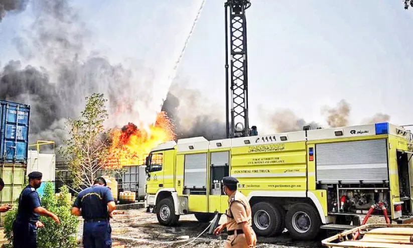 text_fieldsസിവിൽ ഡിഫൻസ് ആൻഡ് ആംബുലൻസ് അതോറിറ്റി പ്രവർത്തകർ തീപിടിത്തം അണക്കുന്നു