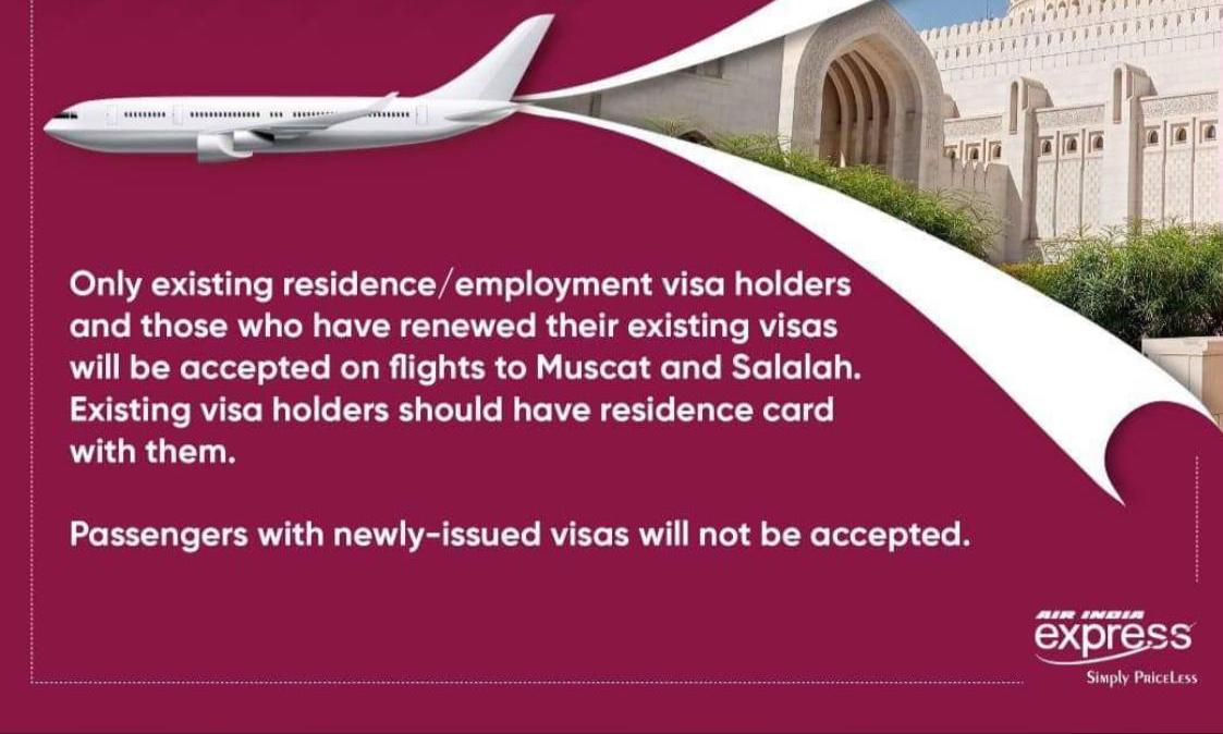 നിലവിൽ റസിഡൻറ് വിസയുള്ളവർക്കും പുതുക്കിയവർക്കും മാത്രമാണ് മസ്കത്തിലേക്കും സലാലയിലേക്കുമുള്ള വിമാനങ്ങളിൽ യാത്രാനുമതി ലഭിക്കുകയുള്ളൂവെന്ന് കാട്ടി എയർ ഇന്ത്യ എക്സ്പ്രസ് അധികൃതർ ഒൗദ്യോഗിക അറിയിപ്പും പുറപ്പെടുവിച്ചിട്ടുണ്ട്. വിസ നിലവിലുള്ളവരുടെ കൈവശം റസിഡൻറ് കാർഡ് ഉണ്ടായിരിക്കുകയും വേണമെന്ന് അറിയിപ്പിൽ പറയുന്നു. എന്നാൽ വിലക്ക് സംബന്ധിച്ച് ഒമാൻ അധികൃതർ ഇതുവരെ ഒൗദ്യോഗിക അറിയിപ്പ് പുറപ്പെടുവിച്ചിട്ടില്ല.