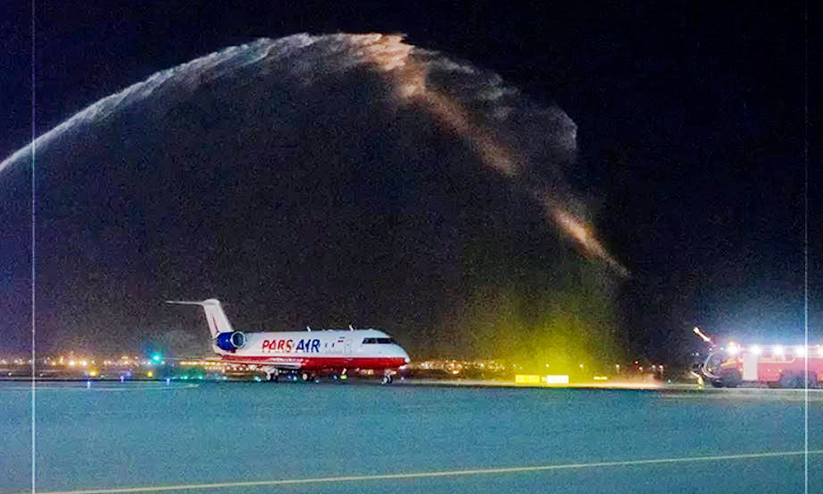 മസ്കത്ത് എയർപോർട്ടിൽ എത്തിയ പാർസ് എയറിന്റെ ആദ്യ വിമാനത്തെ വാട്ടർ സല്യൂട്ട് നൽകി സ്വീകരിക്കുന്നു