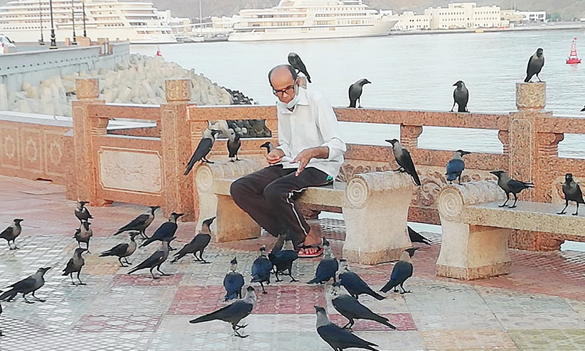 ഈ കൗതുകക്കാഴ്ച മത്ര കോര്ണീഷിലെ പതിവ് പ്രഭാതനടത്തക്കാർക്ക് പുതുമയല്ല. ദിവസവും അതിരാവിലെ ദൗത്യമെന്നപോലെ കോര്ണീഷിലെത്തി കാക്കകള്ക്ക് തീറ്റ നല്കി അവര്ക്കൊപ്പം കഴിഞ്ഞാണ് ഗുജറാത്തിലെ ബറോഡ സ്വദേശിയായ ഇദ്ദേഹം മടങ്ങുക. മത്ര സൂഖില് തുണിക്കടയില് സെയില്സ്മാനാണ്. ഗോതമ്പ് മാവില് പഞ്ചസാര മിശ്രിതം ചേര്ത്ത് ചെറിയ ഉരുളകളാക്കിയാണ് പ്രാതല് ഒരുക്കുന്നത്. ഭംഗിയില്ലെന്ന് കരുതി കാക്കയെ അവഗണിക്കാന് പറ്റില്ലെന്നും അവയും പക്ഷി വര്ഗത്തില്പെട്ട ജീവിയാണെന്നുമാണ് സുരേഷ് പറയുന്നത്.