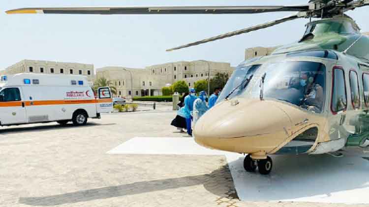 ജബൽ അഖ്ദറിൽനിന്ന് എത്തിച്ച രോഗിയെ ഹെലിപാഡിൽനിന്ന് ആംബുലൻസിലേക്ക് മാറ്റുന്നു