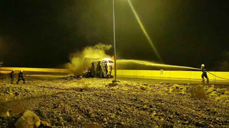 ഖസബിൽ മറിഞ്ഞ ട്രക്കിലെ തീയണക്കുന്നു