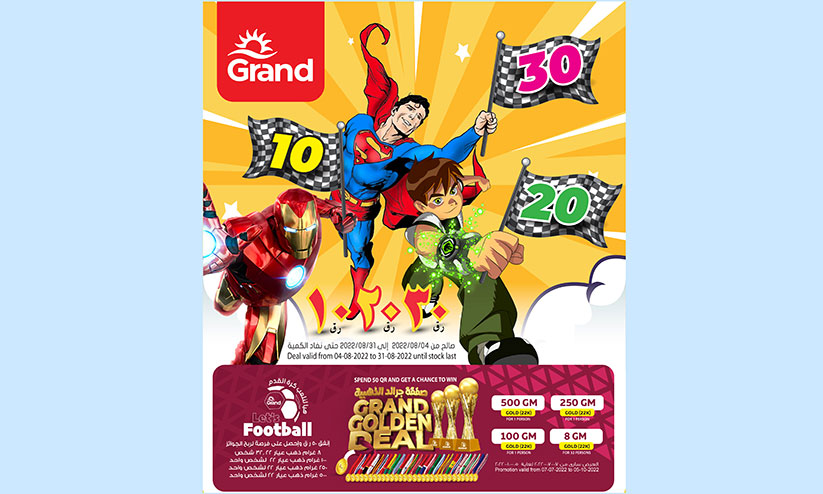 2022 ഫുട്ബാൾ ലോകകപ്പ് വരവേൽക്കാനായി ഗ്രാൻഡ് മാൾ ഹൈപ്പർമാർക്കറ്റിന്റെ പുതിയ മെഗാ പ്രമോഷൻ എല്ലാ ഔട്ലറ്റുകളിലുമായി തുടരുകയാണ്. ദോഹയിലെ ഏതു ഗ്രാൻഡ് ഹൈപ്പർമാർക്കറ്റിന്റെ ഔട്ലറ്റുകളിൽനിന്നും 50 ഖത്തർ റിയലിനോ അതിനു മുകളിലോ ഷോപ്പിങ് നടത്തുമ്പോൾ ലഭിക്കുന്ന റാഫിൾ കൂപ്പൺ വഴി എല്ലാ ഉപഭോക്താക്കൾക്കും ഒക്ടോബർ അഞ്ചുവരെ ഈ സമ്മാന പദ്ധതിയിൽ പങ്കാളികളാകാം. ഭാഗ്യശാലികളെ കാത്തിരിക്കുന്നത് ഓരാൾക്കുവീതം 500 ഗ്രാം, 250 ഗ്രാം, 100 ഗ്രാം സ്വർണക്കപ്പാണ്. ഇതിനു പുറമെ, 32 പേർക്ക് എട്ടു ഗ്രാം സ്വർണമെഡലും സമ്മാനമായി നൽകും.