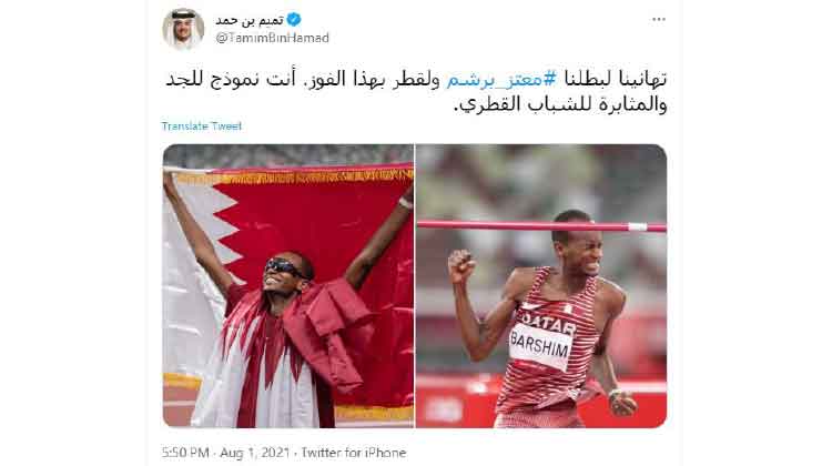 ദോഹ: ടോക്യോ ഒളിമ്പിക്സിൽ ഖത്തറിനായി രണ്ടാം സ്വർണം നേടിയ ഹൈജംപ് താരം മുഅതസ് ബർഷിമിന് അമീർ ശൈഖ് തമീം ബിൻ ഹമദ് ആൽഥാനിയുടെ അഭിനന്ദനം. ട്വിറ്റർ സന്ദേശത്തിൽ നമ്മുടെ ഹീറോക്ക് അഭിനന്ദനങ്ങൾ എന്ന് പറഞ്ഞായിരുന്നു അമീറിെൻറ അഭിനന്ദനം. സ്ഥിരോത്സാഹത്തിനും കഠിനാധ്വാനത്തിനും രാജ്യത്തെ യുവതലമുറക്ക് മാതൃകയാണ് ബർഷിമെന്നും അമീർ പറഞ്ഞു.