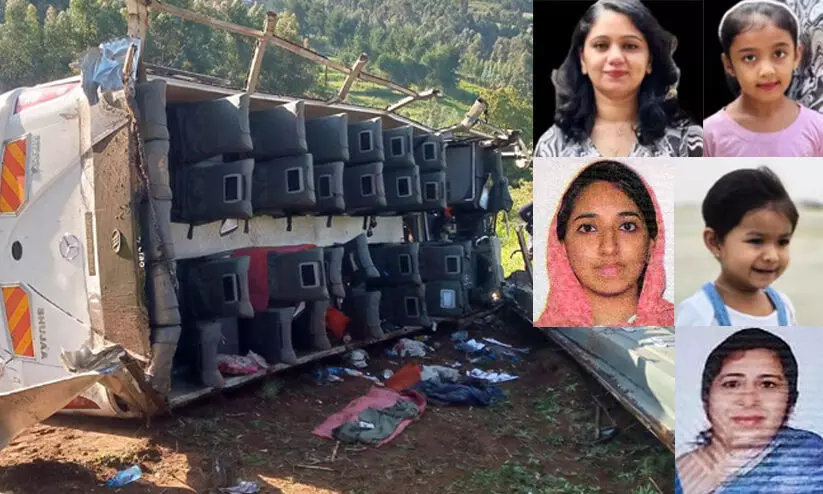 text_fields1. കെനിയയിൽ അപകടത്തിൽപ്പെട്ട ബസ് 2. മരിച്ച റിയ ആൻ, മകൾ ടൈറ, ജസ്ന കുറ്റിക്കാട്ടുചാലിൽ, മകൾ റൂഹി മെഹ്റിൻ, ഗീത ഷോജി ഐസക്,