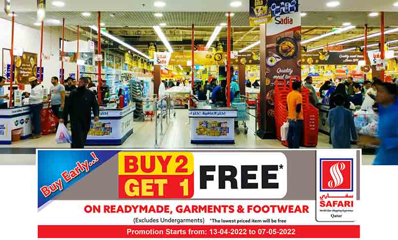 ഏപ്രിൽ 13 മുതൽ ഏഴു മേയ് വരെ ദോഹയിലെ എല്ലാ സഫാരി ഔട്ട്ലറ്റുകളിലും പ്രമോഷൻ ലഭ്യമാണ്. നിരവധി വൈവിധ്യവും ഗുണമേന്മയും നിറഞ്ഞ ഉൽപന്നങ്ങൾ കുറഞ്ഞനിരക്കിൽ ഉപഭോക്താക്കൾക്ക് ലഭിക്കുന്നു എന്ന് ഉറപ്പാക്കാനും അതുവഴി ഉപഭോക്തൃ സംതൃപ്തി നേടാനും സഫാരിക്ക് സാധിച്ചിട്ടുണ്ട്. റമദാൻ, ഈദ് പ്രമാണിച്ച് ഉണ്ടാകാനിടയുള്ള തിരക്കിനെ ഒഴിവാക്കാനും ഉപഭോക്താക്കളുടെ ഷോപ്പിങ് സുഖമമാക്കാനും വേണ്ടിയാണ് ഇത്തവണ വളരെ നേരത്തേ തന്നെ 'സഫാരി ബൈ ടു ഗെറ്റ് വൺ ഫ്രീ പ്രമോഷൻ' ആരംഭിച്ചിരിക്കുന്നത്. ഈ അവസരം തങ്ങളുടെ ഉപഭോക്താക്കൾ ഉപയോഗപ്പെടുത്തുമെന്നുമാണ് പ്രതീക്ഷിക്കുന്നതെന്നും സഫാരി ഗ്രൂപ് മാനേജ്മെന്റ് പത്രക്കുറിപ്പിൽ അഭിപ്രായപ്പെട്ടു.