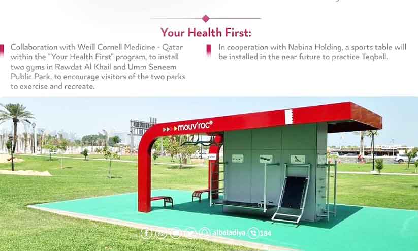 അതേസമയം, യുവർ ഹെൽത്ത് ഫസ്റ്റ് (നിങ്ങളുടെ ആരോഗ്യം ആദ്യം) സംരംഭത്തിലൂടെ വെയിൽ കോർണെൽ മെഡിസിൻ ഖത്തറുമായി സഹകരിച്ച് സാമൂഹിക സഹകരണത്തിന്റെ ഭാഗമായി റൗദത് ഖൈൽ പാർക്ക്, ഉമ്മുൽ സനീം പാർക്ക് എന്നിവിടങ്ങളിൽ മന്ത്രാലയം രണ്ട് ജിമ്മുകൾ സ്ഥാപിച്ചു. ടെക്ബാളിനായി നബിന ഹോൾഡിംഗുമായി സഹകരിച്ച് സ്പോർട്ട് ടേബിൾ ഉടൻ തന്നെ സ്ഥാപിക്കും. പൊതു പാർക്കുകളിലും വിശാലമായ ഹരിത പ്രദേശങ്ങളിലും റിക്രിയേഷനൽ, കായിക കേന്ദ്രങ്ങൾ വർധിപ്പിക്കുകയെന്ന ലക്ഷ്യം മുൻനിർത്തിയാണ് മുനിസിപ്പാലിറ്റി മന്ത്രാലയത്തിന് കീഴിലുള്ള പബ്ലിക് പാർക് വിഭാഗം ഇത്തരം സംരംഭങ്ങളുമായി മുന്നിട്ടിറങ്ങിയിരിക്കുന്നത്.