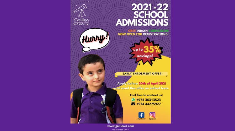 ഇന്ത്യൻ സ്കൂളിൽ കുട്ടികൾക്ക് പ്രവേശനം ആഗ്രഹിക്കുന്ന രക്ഷിതാക്കൾക്കുള്ള മികച്ച അവസരമാണിത്. ഉന്നത യോഗ്യതയുള്ള വർഷങ്ങളുടെ പ്രവൃത്തിപരിചയമുള്ള അധ്യാപകരാണ് ഗലീലിയോ സ്കൂളിെൻറ പ്രത്യേകത. ഭാവിയിലേക്കുള്ള എല്ലാ യോഗ്യതയുമുള്ള വിദ്യാർഥികളെ വളർത്തിയെടുക്കാനായി വിവിധ പാഠ്യപാഠ്യേതര പ്രവർത്തനങ്ങളാണ് സ്കൂളിലുള്ളത്.ഫോൺ: +974 44275927. വാട്സ്ആപ്: +974 30313523.