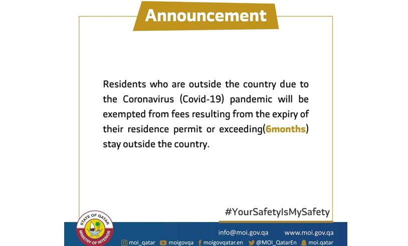 ഇത്തരം വിദേശികൾക്ക് റെസിഡൻസി പെർമിറ്റ് (ആർ.പി) കാലാവധി കഴിഞ്ഞതിനുള്ള ഫീസ് വേണ്ടെന്നും ആറു മാസത്തില് കൂടുതല് വിദേശത്തു കഴിഞ്ഞത് മൂലമുള്ള ഫീസുകളിൽ നിന്ന് ഇവരെ ഒഴിവാക്കിയിട്ടുണ്ടെന്നും ഖത്തർ ആഭ്യന്തര മന്ത്രാലയം അറിയിച്ചു.