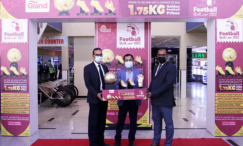 ദോഹ: ലോകകപ്പ് ഫുട്ബാളിനെ വരവേറ്റുകൊണ്ട് ഖത്തറിലെ പ്രമുഖ റീട്ടയിൽ വ്യപാര ശൃംഖലയായ ഗ്രാൻഡ് മാൾ ഹൈപ്പർമാർക്കറ്റിൽ പുതിയ മെഗാ പ്രമോഷൻ ആരംഭിച്ചു. ഫുട്ബാൾ ലോകകപ്പ് മുന്നോടിയായി ഉപഭോക്താക്കൾക്കായി 1 .75 കിലോ ഗോൾഡൻ ഫുട്ബാൾ സമ്മാനമാണ് ഇത്തവണ ഗ്രാൻഡ് മാൾ ഹൈപ്പർമാർക്കറ്റ് ഒരുക്കിയിരിക്കുന്നത്.