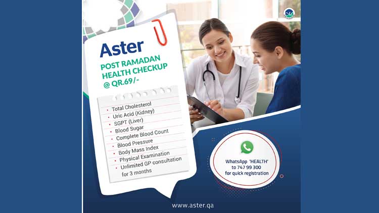 റമദാനിനു ശേഷം പരിശോധനകൾ നടത്തുന്നത് നോമ്പ് എടുക്കുന്നതിലൂടെ ശരീരത്തിന് വന്നിട്ടുള്ള മാറ്റങ്ങൾ മനസ്സിലാക്കാൻ സഹായിക്കുകയും അത് റമദാൻ മാസത്തിലെ നല്ല ശീലങ്ങൾ തുടർന്നുകൊണ്ട് പോകുന്നതിന് സഹായിക്കുമെന്നും ആസ്റ്റർ മെഡിക്കൽ സെൻറർ ഇൻഡസ്ട്രിയൽ ഏരിയയിലെ ഇേൻറണൽ മെഡിസിൻ സ്പെഷലിസ്റ്റ് ഡോ. ഷംസീർ പാലോറ പറഞ്ഞു. ഖത്തറിലെ സി റിങ് റോഡ് (സബ് വേ സിഗ്നലിന് സമീപം), അൽ ഹിലാൽ (വഖൂദ് പെട്രോൾ സ്റ്റേഷന് സമീപം), ഇൻഡസ്ട്രിയൽ ഏരിയ (സ്ട്രീറ്റ് ഒന്നിനും ഫൂട്ട് ഓവർ ബ്രിഡ്ജിനും സമീപം), അൽ റയ്യാൻ (ഷാഫി മസ്ജിദിന് സമീപം), അൽ ഖോർ (ലുലുമാളിന് സമീപം) എന്നിവിടങ്ങളിലുള്ള മുഴുവൻ ആസ്റ്റർ മെഡിക്കൽ സെൻററിലും ഈ പരിശോധന ലഭിക്കും. ഫോൺ: 44440499.