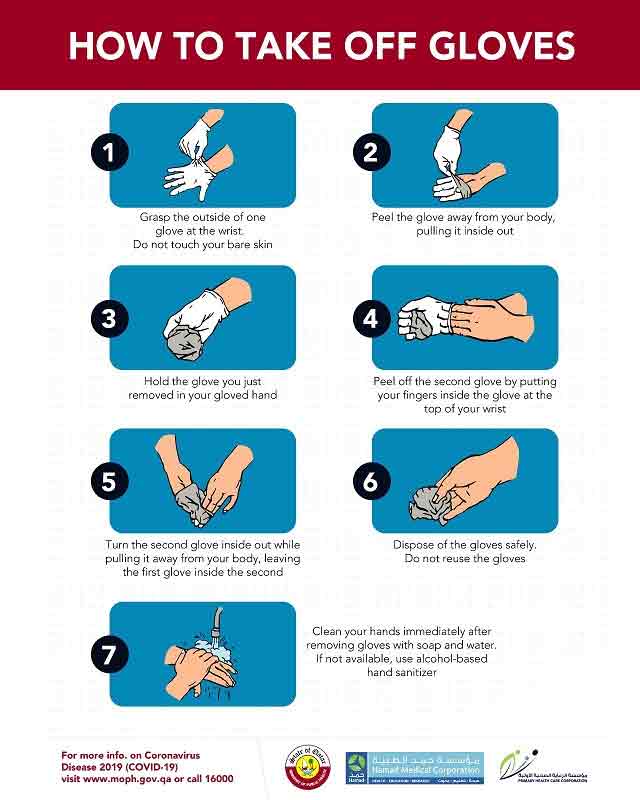- കൈയുറ ധരിക്കുന്നതിന് മുമ്പും ശേഷവും സോപ്പും വെള്ളവും ഉപയോഗിച്ചോ ആൽക്കഹോൾ അടങ്ങിയ സാനിറ്റൈസർ ഉപയോഗിച്ചോ വൃത്തിയാക്കുക.