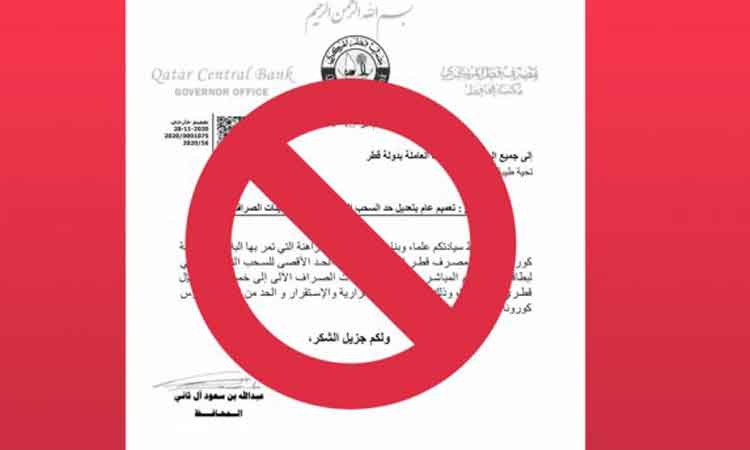 ക്യു.സി.ബിയുടേതാണെന്ന് പറഞ്ഞുള്ള നോട്ടീസും പ്രചരിക്കുന്നുണ്ട്. 5000 റിയാൽ മാത്രമേ എ.ടി.എമ്മിൽ നിന്ന് ഒരു ദിവസം ഇനി പിൻവലിക്കാൻ കഴിയൂവെന്നാണ് ഇതിൽ പറയുന്നത്. ഇത്തരത്തിലുള്ള ഒരു നോട്ടീസും വിവരവും തങ്ങൾ പുറത്തുവിട്ടിട്ടില്ലെന്ന് ക്യു.സി.ബി അറിയിച്ചു. എല്ലാ വിവരങ്ങളും ഔദ്യോഗിക സ്രോതസ്സുകളിൽ നിന്ന് മാത്രമേ തേടാവൂവെന്നും അല്ലാത്ത വിവരങ്ങൾ സമൂഹമാധ്യമങ്ങളിലൂടെ പ്രചരിപ്പിക്കരുതെന്നും ബാങ്ക് വ്യക്തമാക്കി. ഇത്തരത്തിൽ വ്യാജകാര്യങ്ങൾ പ്രചരിപ്പിക്കുന്നവർക്കെതിെര നിയമനടപടി വരാം.