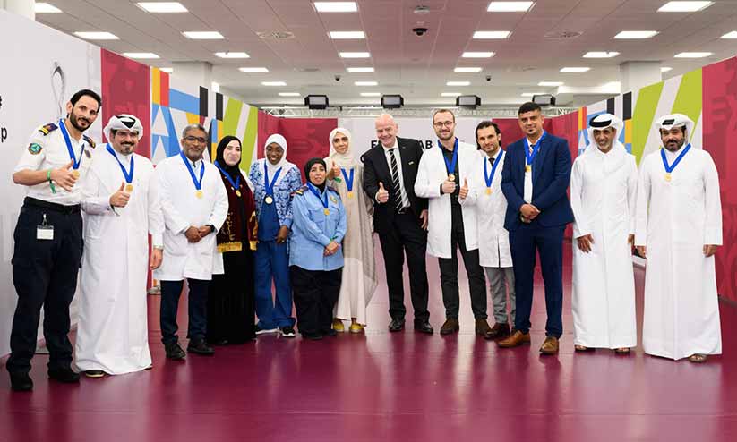 text_fieldsഅറബ് കപ്പ് ഫൈനൽ വേദിയിൽ ആദരിച്ച ആരോഗ്യപ്രവർത്തകർക്കൊപ്പം ഫിഫ പ്രസിഡൻറ് ജിയാനി ഇൻഫൻറിനോയും ശൈഖ് ഹമദ് ബിൻ ഖലീഫയും. ഇടതുനിന്ന് മൂന്നാമത് ഡോ. റസീം
