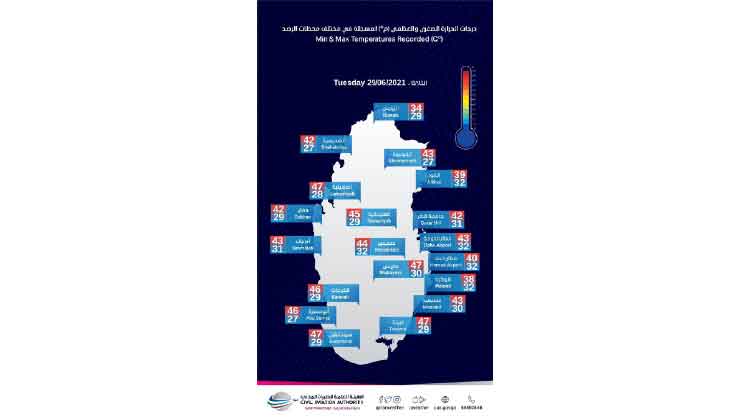 ചൊവ്വാഴ്ച ദോഹയിൽ 40 ഡിഗ്രി അടയാളപ്പെടുത്തി. മുകൈനീസിലും ജുമൈലിയയിലും ഉയർന്ന താപനിലയായ 48 ഡിഗ്രി റിപ്പോർട്ട് ചെയ്തു. തുറസ്സായ സ്ഥലങ്ങളിലും സൈറ്റുകളിലും ഉച്ചസമയങ്ങളിൽ തൊഴിലാളികളെകൊണ്ട് ജോലിചെയ്യിക്കുന്നതിനും വിലക്കുണ്ട്. 11 മുതൽ, മൂന്ന് വരെ പൊതു ഇടങ്ങളിൽ ജോലി ചെയ്യിച്ചാൽ തൊഴിലുടമക്കെതിരെ നടപടിയും കനത്ത പിഴയും ചുമത്തപ്പെടും.